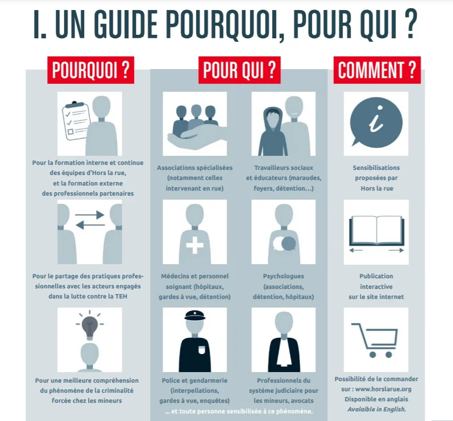 « Basé sur l’expérience, les réflexions, les pratiques des salariés et anciens salariés d’Hors la rue, ce guide capitalise toutes ces années de repérage et d’accompagnement auprès des mineurs victimes de criminalité forcée.